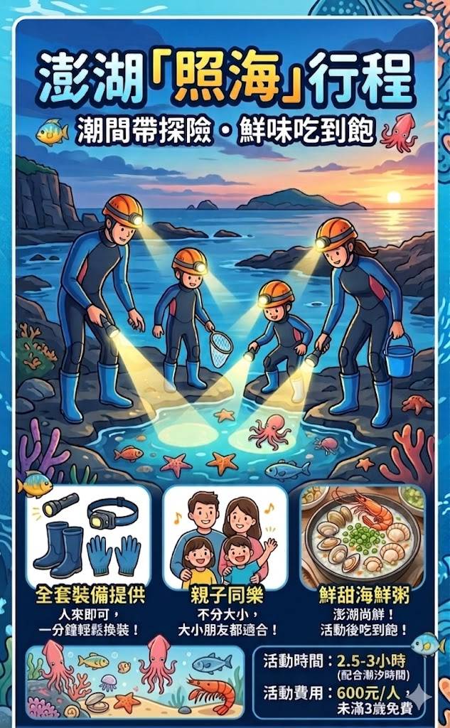 行程內容: 自行騎機車或開車前往山水集合(沿路有指標),可觀賞各種海洋生物(小丑魚、海葵、藍雀鯛、熱帶魚、河豚、海蔘、海膽),體驗海底世界,享用道地澎湖麵線。備註:活動時間:09:00、14:00每次約三小時 三歲以上全票計。 注意如有高血壓、心臟病以及各種特殊隱藏疾病,為了您的安全,請勿強行參與並先告知岸上活動工作人員! ※每人投保之保險:依船公司所公告之保險內容。 |
